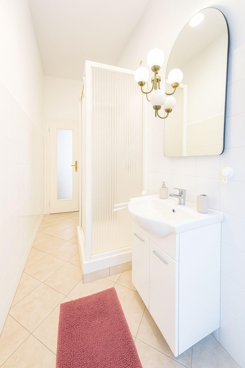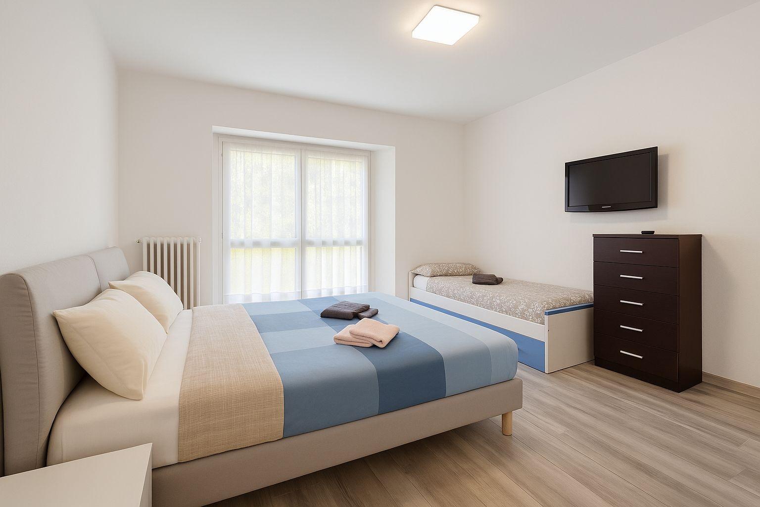 Il bilocale offre ambienti luminosi e ben organizzati, con una cucina completamente attrezzata e dotata di elettrodomestici, compreso il frigorifero con congelatore. La zona notte dispone di un letto matrimoniale, due letti singoli e un divano letto, insieme a una TV e capienti armadi. Il bagno è moderno, con doccia e lavatrice, mentre il piccolo balcone permette di ritagliarsi un momento di relax. L’alloggio è climatizzato in ogni stagione e coperto da connessione Wi-Fi.